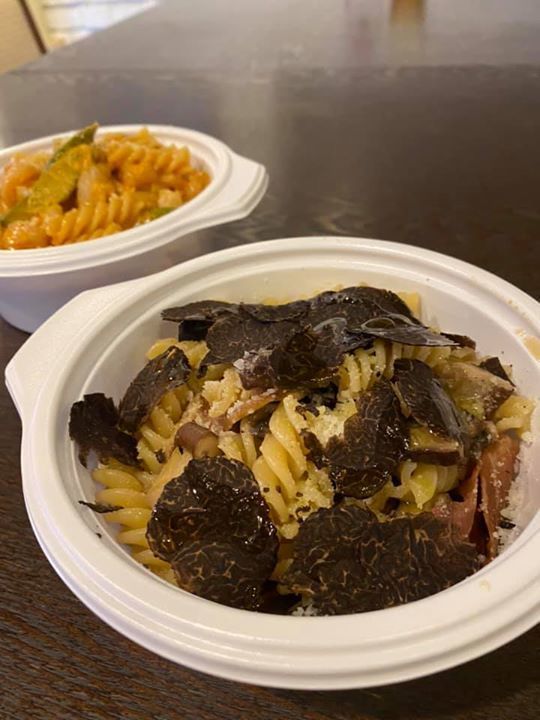 1つは、『小エビとアスパラのトマトクリーム』と『キノコと生ハムのパスタ、たっぷりトリュフかけ〜』キノコ〜のパスタの方は、ソースをクリームorビアンコ(塩)をお選びいただけます🙇♂️