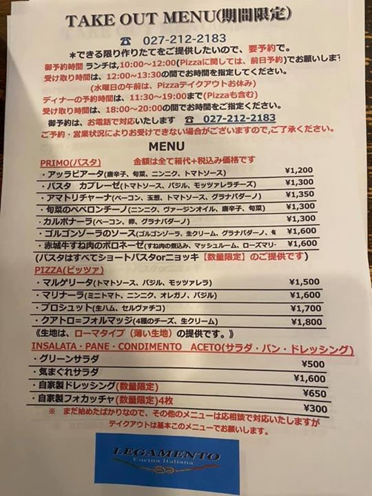 そこで、レガメントでもこの宣言を受け、4月22日〜5月6日まで、ランチ通常営業(Aperto11:30〜14:00LO 15:00Chiuso)+テイクアウト(受付、前日と当日10:00〜12:00まで。尚、Pizzaに関しては、前日予約。 受け取り時間 12:00〜13:30まで。)