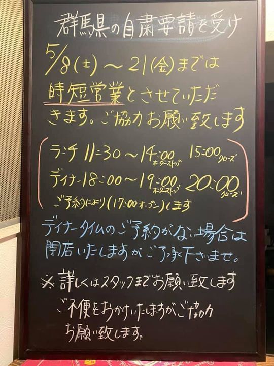 いよいよ、明日(5月8日)〜21日(金)まで時短営業要請が発令。