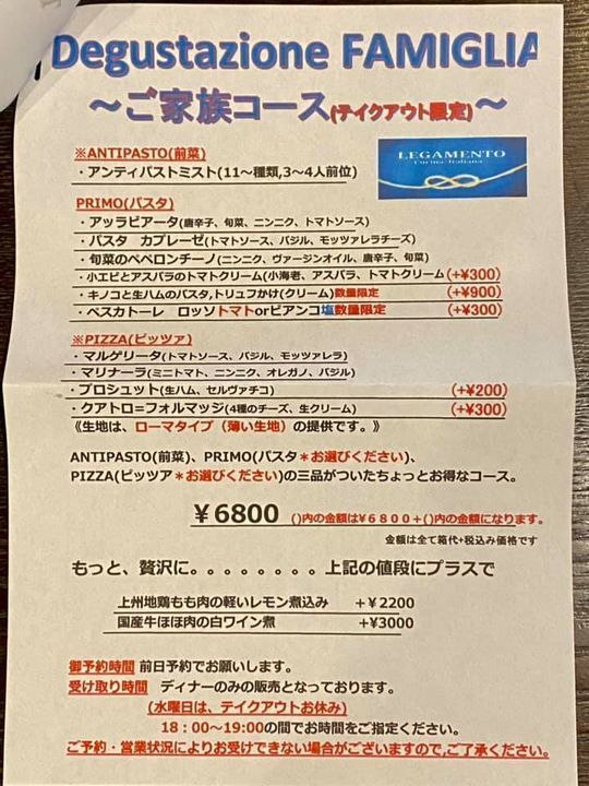 コース(¥3500、¥4000、¥6000、¥7500→このコースのみ3日前までに御予約ください。)のみの提供となります(※メイン付きのコースは、前日までのご予約。当日は、パスタコースの対応となります。ご了承ください。)